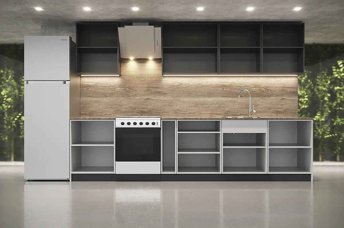 Ручки, столешница, стеновая панель, мойка, смеситель и бытовая техника продаются отдельно.